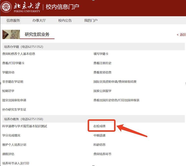 路径1:登陆“校内信息门户”——点击“研究生院业务”——选择“在校成绩”——进入“学分自查”界面,查看本人学分完成情况和课程属性情况具体信息。