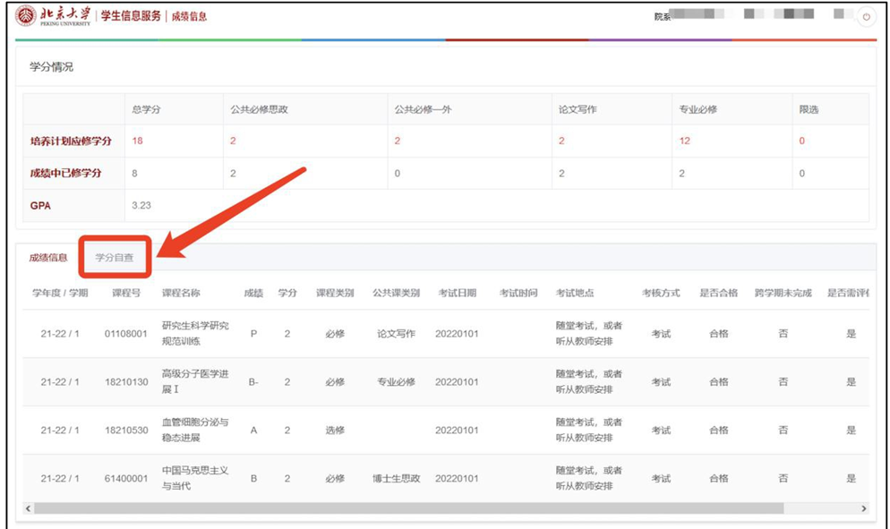 1.学生可随时通过“学分自查”功能查看当前的学分完成情况,包括应修学分、已修学分和各类课程的学分完成情况(后附常见问题)。二、查询路径