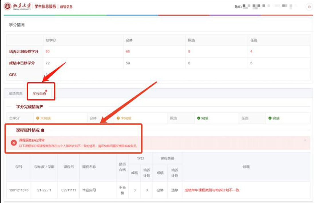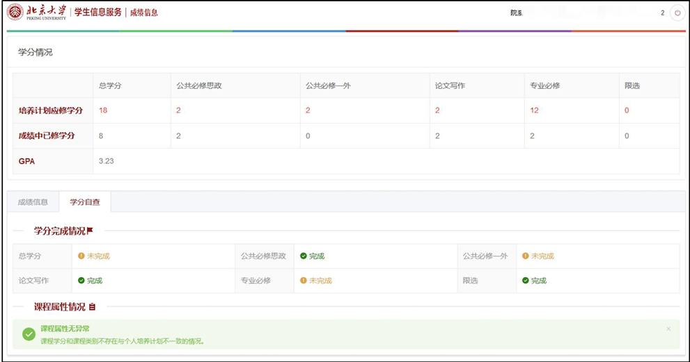 (学分自查还不能准确识别通过选课系统添加到培养计划的课程类别认定。)