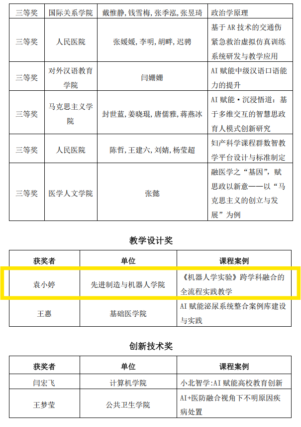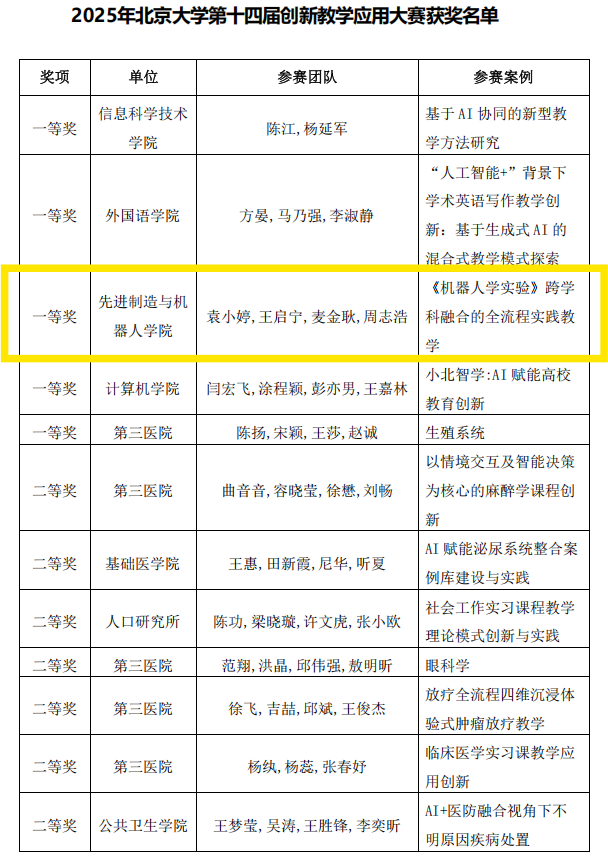 近日,北京大学第十四届创新教学应用大赛圆满落下帷幕。我院机器人教学团队在本次大赛中表现出色,荣获多个奖项,充分展现了学院在教学创新方面的实力和水平。