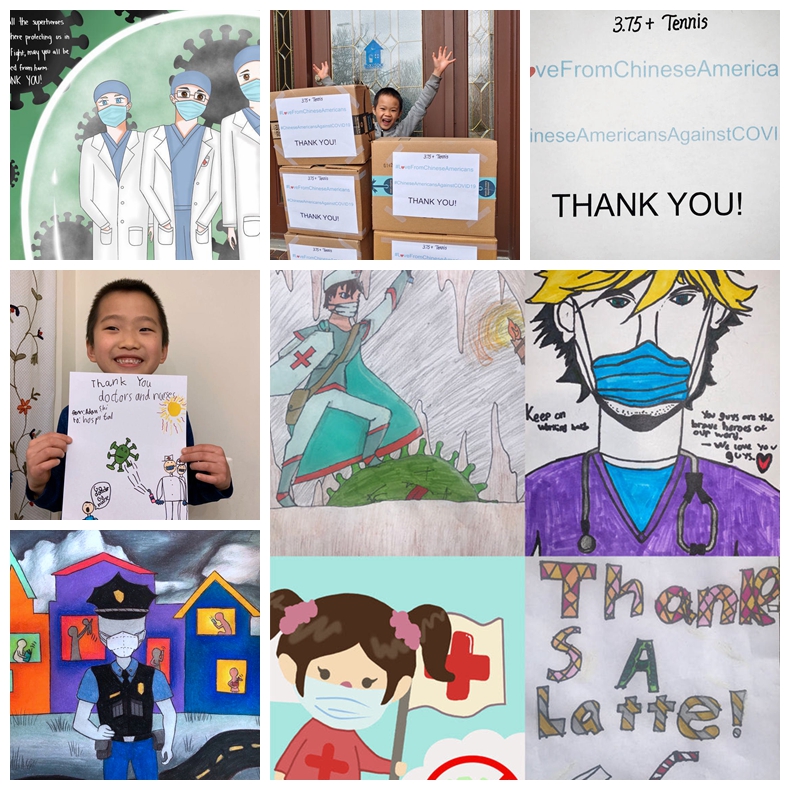 此次活动的成功离不开每一位成员及其家庭的热心支持。在3300个口罩下单以后,为了确保这些口罩能被顺利寄出和快速通关,33个家庭提供了住址,发货方精心分配,打包成66个包裹发往底特律。每个家庭收到后将小包口罩送到预先安排好的收集点,由收集点负责人汇总、装箱后送到指派的机构。组织者的精心安排实现了各环节的无缝衔接。毛小锋校友记录下了这一过程中诸多闪光的人与瞬间:Hong Yan女士的热心帮助、细致严谨地筛选货源和联络快递公司,使这批包裹能够以如此惊人的速度飞抵底特律;许多家庭的孩子也参与其中,有的帮爸爸妈妈打包整理口罩,有的用画笔画出对并肩战斗在抗疫一线的医生、护士、警察的敬意……