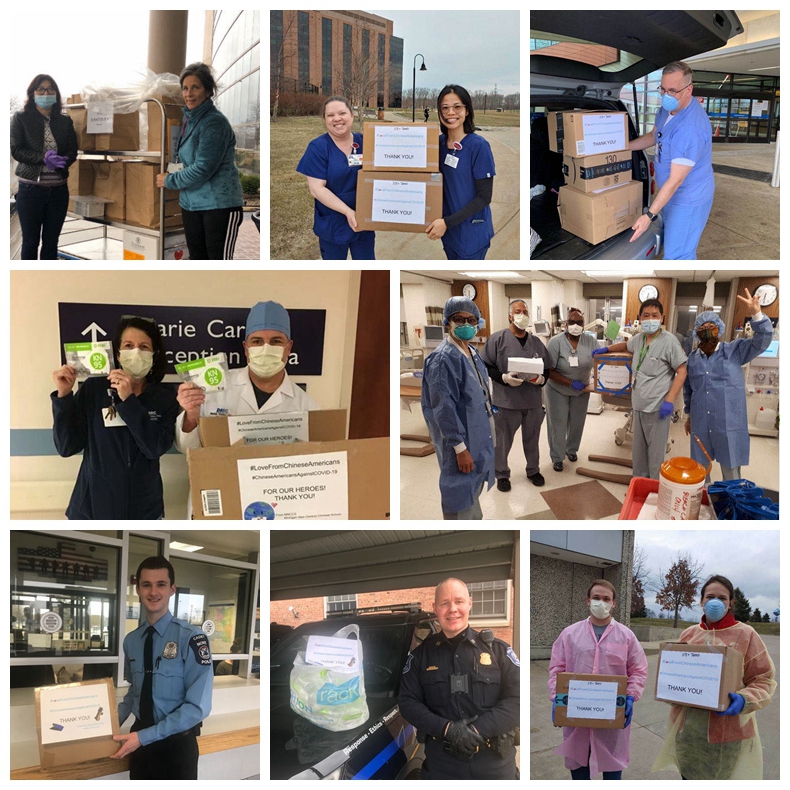 由“3.75+”群发起的这次行动,还得到了密西根新世纪中文学校(MNCCS)和中文学校学术比赛团队(AG Team)的大力响应。在通力协作下,此次捐赠活动筹集资金总额8888美元,购买KN95 口罩 3300个,48小时内从中国发货到底特律,收货两天内便将所有口罩送至地方医院,五天内完成了从策划到发放的所有工作。